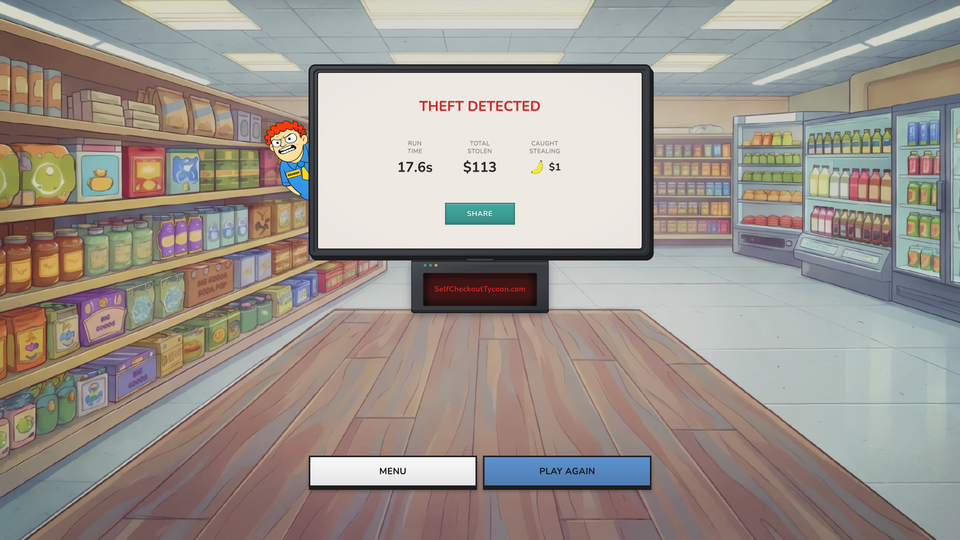 “Steal groceries, dodge security, don't get caught. Self-Checkout Tycoon by Labby Labs.”